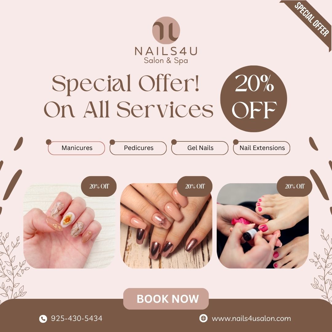 To celebrate their commitment to the community, Nails4U Salon & Spa is currently running a Special Offer. Clients can enjoy 20% OFF on all services, including manicures, pedicures, gel nails, and extensions. This limited-time promotion is the perfect opportunity to try a new trend, such as almond-shaped ombré designs or sophisticated neutral shades, at a significantly reduced price.